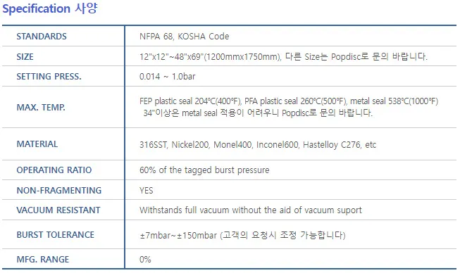 PVCFS(Composite Flat Square) / PVCFR(Composite Flat Rectangular) Explosionvent panel은 Top panel, Sealing sheet, Support panel의 3가지 구성요소로 이루어져 있습니다.Top panel은 Panel의 파열 압력을 조정하고, 중간의 Sealing sheet는 공정상의 유체로부터 누출을 막고, Support panel은 전체 Panel을 지지하는 역할을 합니다.파열 설계값에 의해 의도적으로 가공되어진 파열부분이 유체의 내부 압력에 의해 파열되는 Type입니다.표준 또는 비표준 Companion flanges/Frames 사이에 Gasket와 같이 설치됩니다.