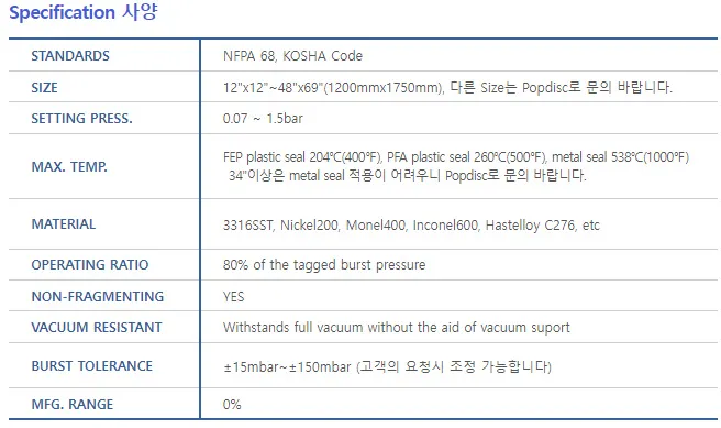 저압의 적용에 적합한 type입니다.Sealing sheet는 Teflon(PFA)이 주로 사용되나, 공정의 조건에 따라 다양한 재질을 적용할 수 있습니다.(PFA, PTFE, FEP, SUS316L, Monel400, Inconel600, etc)Gasket로는 Non-Asbestos, Teflon, Silicon, Rubber등 다양한 재질을 사용합니다.필요시 Vacuum support를 적용하여 Vacuum에도 견딜 수 있습니다.Alarm sensor system을 적용하여 Panel의 파열 여부를 Control room에서 모니터링할 수 있습니다.Flat type과 비교해 금속의 피로도나 순환 내구 기간이 더욱 개선됩니다.