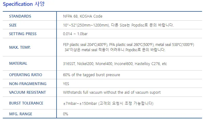 PVCFC(Composite Flat Circular) Explosion Vent panel은 Top panel, Sealing sheet, Support panel의 3가지 구성요소로 이루어져 있습니다.Top panel은 Panel의 파열 압력을 조정하고, 중간의 Sealing sheet는 공정상의 유체로부터 누출을 막고, Support Panel은 전체 Panel을 지지하는 역할을 합니다.파열 설계값에 의해 의도적으로 가공되어진 파열부분이 유체의 내부 압력에 의해 파열되는 Type입니다.표준 또는 비표준 Companion Flanges/Frames 사이에 Gasket와 같이 설치됩니다.